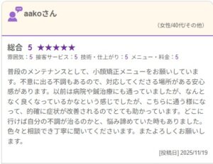 普段のメンテナンスとして、小顔矯正メニューをお願いしています。不意に出る不調もあるので、対応してくださる場所がある安心感があります。以前は病院や鍼治療にも通っていましたが、なんとなく良くなっているかなという感じでしたが、こちらに通う様になって、的確に症状が改善されるのでとても助かっています。どこに行けば自分の不調が治るのかと、悩み諦めていた時もありました。色々と相談でき丁寧に聞いてくださいます。またよろしくお願いします。