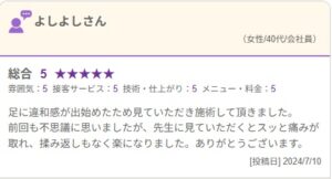 足に違和感がスッと痛みが取れた 2025 12/09 口コミ 膝・足の痛み 2024年8月7日2025年12月9日 足に違和感が出始めたため見ていただき施術して頂きました。前回も不思議に思いましたが、先生に見ていただくとスッと痛みが取れ、揉み返しもなく楽になりました。ありがとうございます。 口コミ 膝・足の痛み 痛み 足の違和感 この記事が気に入ったら いいね または フォローしてね! Follow @344tomoya Follow Me よかったらシェアしてください! URLをコピーする URLをコピーしました! URLをコピーしました!