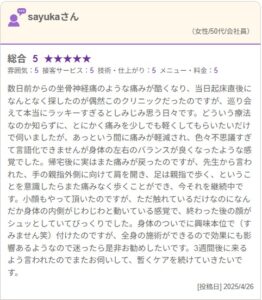 数日前からの坐骨神経痛のような痛みが酷くなり、当日起床直後になんとなく探したのが偶然このクリニックだったのですが、巡り会えて本当にラッキーすぎるとしみじみ思う日々です。どういう療法なのか知らずに、とにかく痛みを少しでも軽くしてもらいたいだけで伺いましたが、あっという間に痛みが軽減され、色々不思議すぎて言語化できませんが身体の左右のバランスが良くなったような感覚でした。帰宅後に実はまた痛みが戻ったのですが、先生から言われた、手の親指外側に向けて肩を開き、足は親指で歩く、ということを意識したらまた痛みなく歩くことができ、今それを継続中です。小顔もやって頂いたのですが、ただ触れているだけなのになんだか身体の内側がじわじわと動いている感覚で、終わった後の顔がシュッとしていてびっくりでした。身体のついでに興味本位で(すみません笑)付けたのですが、全身の施術ができるので効果にも影響あるようなので迷ったら是非お勧めしたいです。3週間後に来るよう言われたのでまたお伺いして、暫くケアを続けていきたいです。